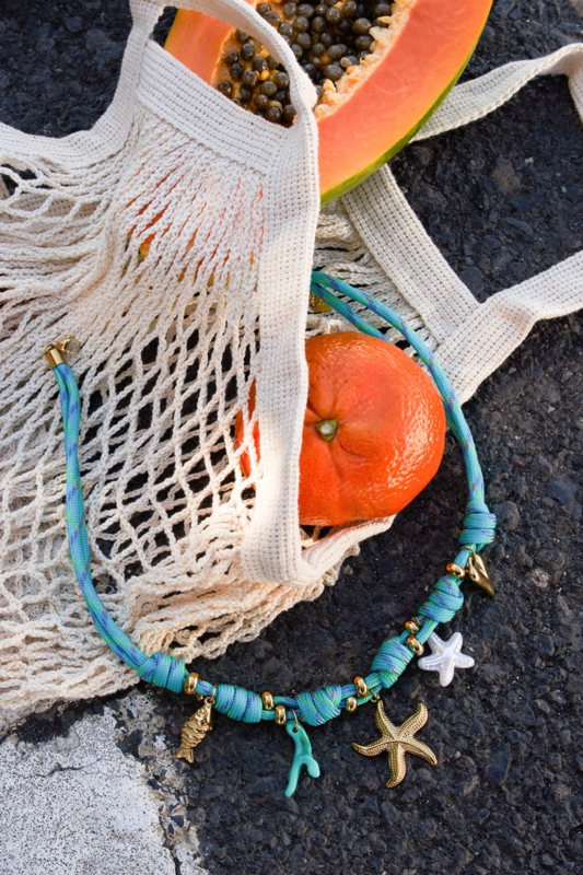 Het is een ketting van stevig blauw touw met allemaal oceaan hangers eraan ππ β¨ Het geeft echt een super leuke, beetje surfer/beach vibe en valt ook lekker op.